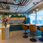 De werktuin wordt afgescheiden door prachtig afgewerkte wanden. In het ontmoetplein is een door ByFlo ontworpen rond gevormde bar geplaatst in zachte tinten terrazzo solid surface met een poot van voorzien van eigentijdse strakke groene tegeltjes. Het blad van de bar is voorzien van een uitschuifbaar beeldscherm. De keuken kreeg een groene tint van materiaal van Decolegno. De verticale streepjes in het materiaal geven een ietwat mannelijk karakter aan de keuken. De ronde vormen daarentegen juist weer wat meer vrouwelijkheid. Het barblad loopt speels door naar een werkplekje met zicht op het Ketelhuisplein. Naast het werkplekje is een ontspannen zit gecreëerd, waarbij de ronding uit het akoestische plafond zich repeteert in de vloer met de kenmerkende print die in het totale gebouw op meerdere plekken terugkomt. De loungestoelen hebben een tweede leven gekregen in dit kantoor.
