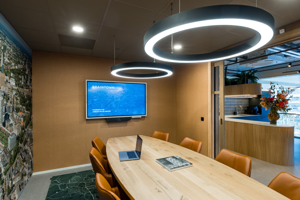Ook de vergaderruimte is met veel zorg vormgegeven. De oranje tinten die staan voor creativiteit komen hier terug in de vergaderstoelen en de wandbekleding van Vescom. De ovale tafel zorgt voor zicht op alle aanwezigen in de ruimte. Daarnaast is een akoestisch systeemplafond van Rockfon in aardse tint toegepast, die samen met de wandprint op peesdoek ervoor zorgen dat de ruimte perfect geluidsdicht is gebleken. De vergaderruimte kan worden afgesloten door stijlvolle schuifdeuren waarin stiekem de letters B en T van Braintown zijn opgenomen.