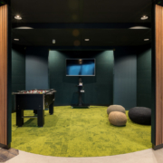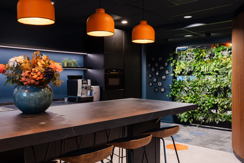 Voor de indeling is de rechttoe rechtaan indeling omgegooid door centraal in de ruimte een akoestische ellips te plaatsen. Een ontmoetplein met functionaliteiten als lounge, stamtafel en woonkeuken met bar zijn gesitueerd. Speelse elementen als een schommel en akoestische ellips zijn toegevoegd voor ontspanning en experience. En dat alles in een huiselijke sfeer.